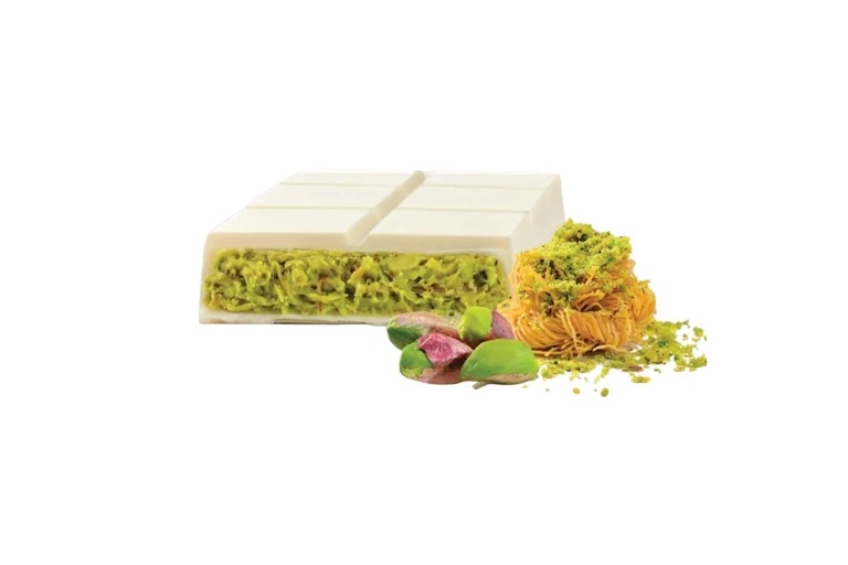 CHOCOLATE BRANCO RECHEADO COM CREME DE PISTACHE E KADAYIF.